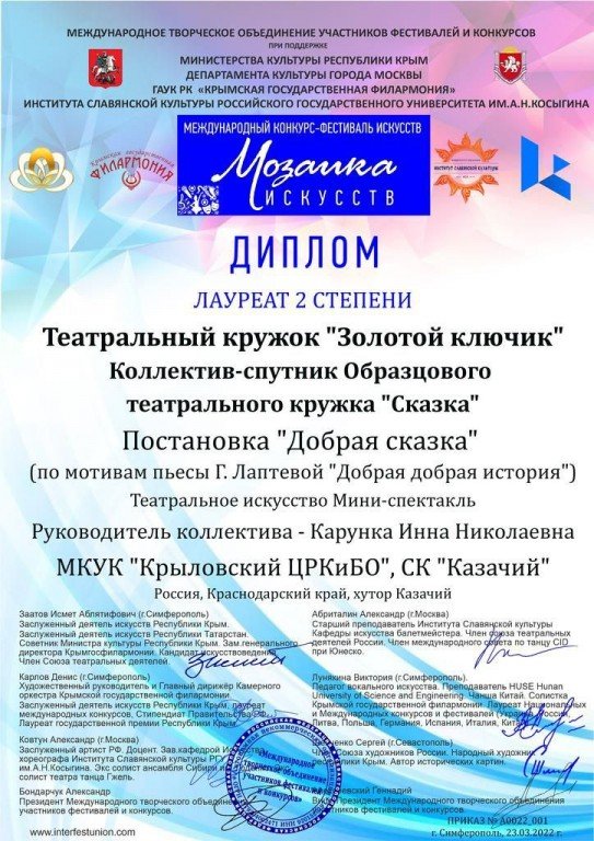 Юные артисты театрального кружка "Золотой ключик" (коллектив-спутник Образцового театрального кружка "Сказка") приняли участие Международном конкурсе детского творчества с очередной постановкой - "Добрая сказка" (по мотивам пьесы Г. Лаптевой "Добрая добрая история").
