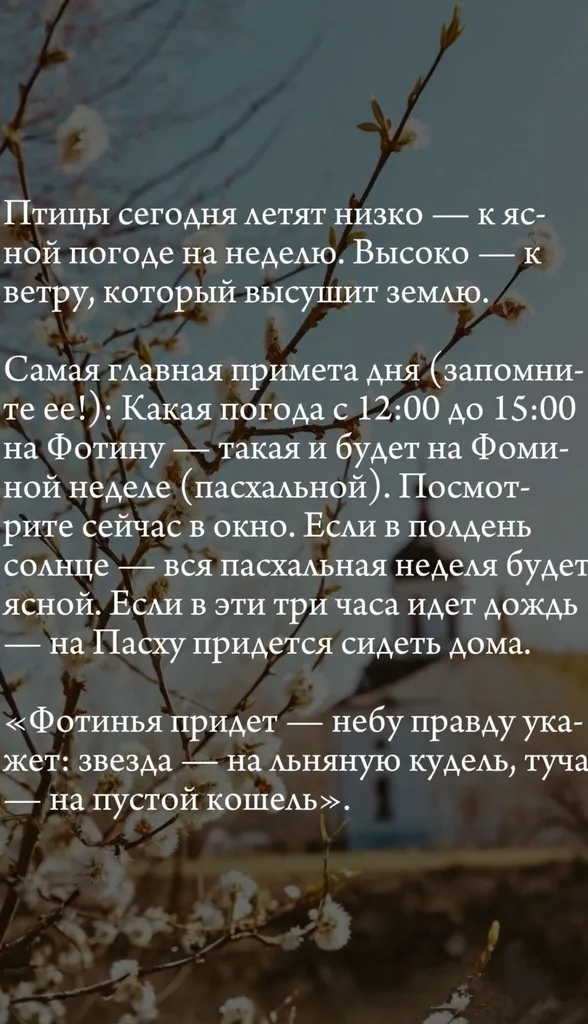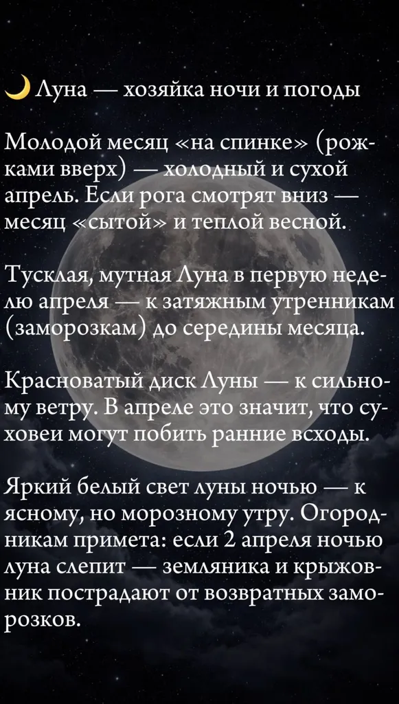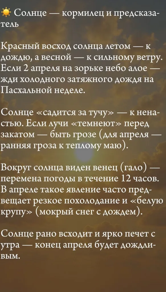Апрель в народе называют «снегогон» и «водолей». Небо в этом месяце особенно изменчиво: утренние морозы сменяются дневным теплом, а тучи бегут так быстро, словно торопятся донести весточку о лете. Сегодня мы поговорим о том, как читать «небесные письмена» — подсказки Солнца, Луны, звезд и облаков. А так как на календаре 2 апреля, не забудем и про особые приметы этого дня.![]()